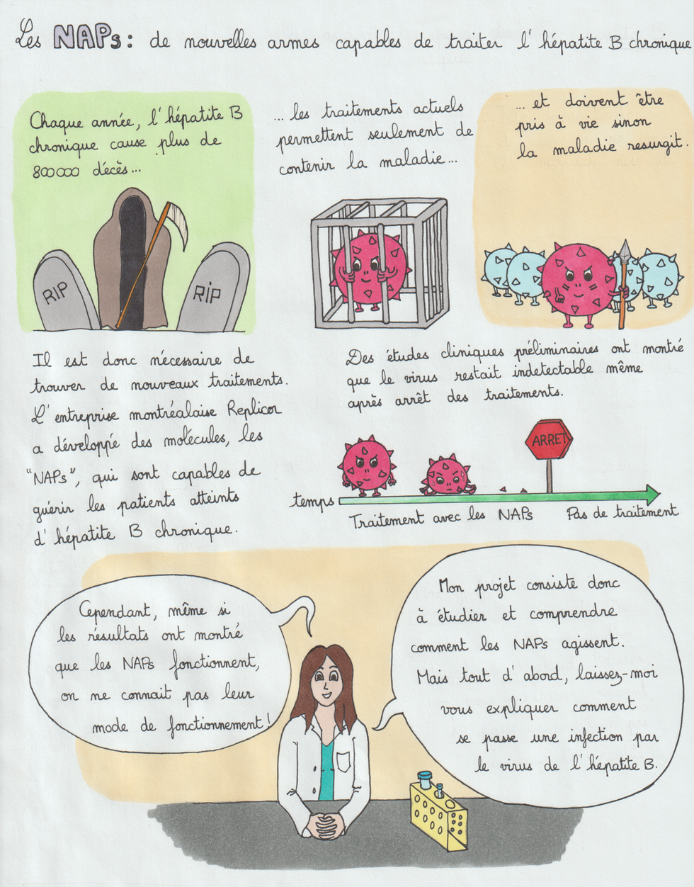 Chaque année, l'hépatite B chronique cause plus de 8 000 000 de décès dans le monde. Les traitements actuels ne permettent pas de guérir la malade, mais seulement de la contenir. Une entreprise montréalaise a par contre développé de nouvelles molécules, les NAPs, qui semblent être capables de guérir les patients atteints de l'hépatite B chronique, pour de bon...