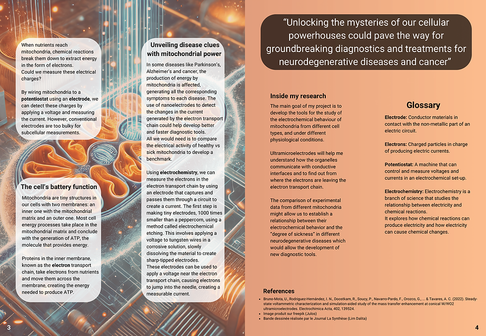 Uriel Mota Bruno est étudiant à la maîtrise dans le laboratoire de la Pre Ana C. Tavares, à l’INRS. Son projet consiste à utiliser de très fines électrodes pour « brancher » les mitochondries à un circuit électrique. Cette approche novatrice permet d’observer leur comportement en temps réel et d’identifier les différences liées à l’état de santé des cellules. Ces découvertes pourraient mener au développement de nouveaux outils de diagnostic pour les maladies neurodégénératives.
